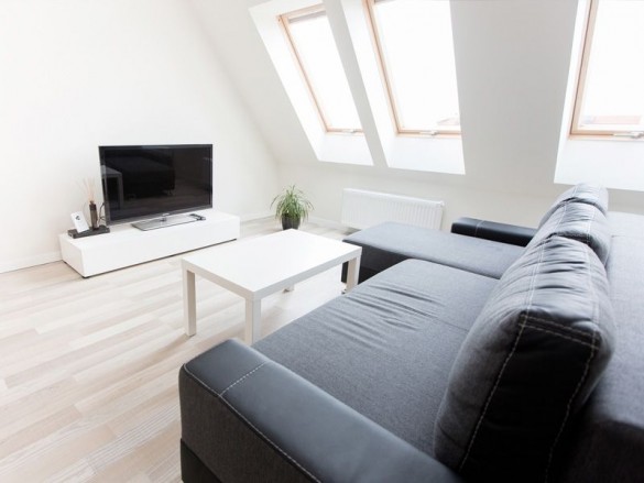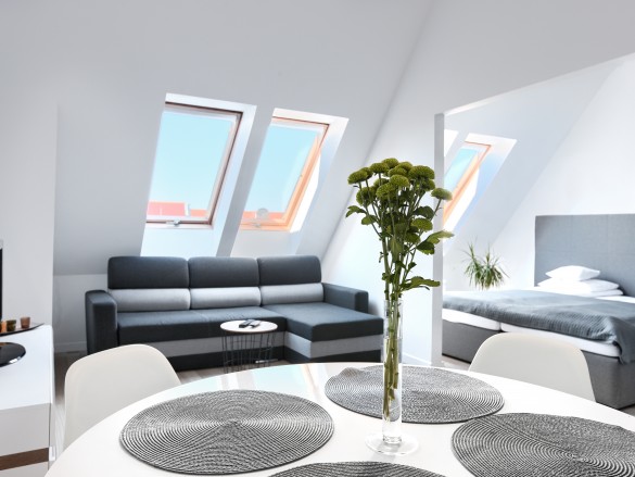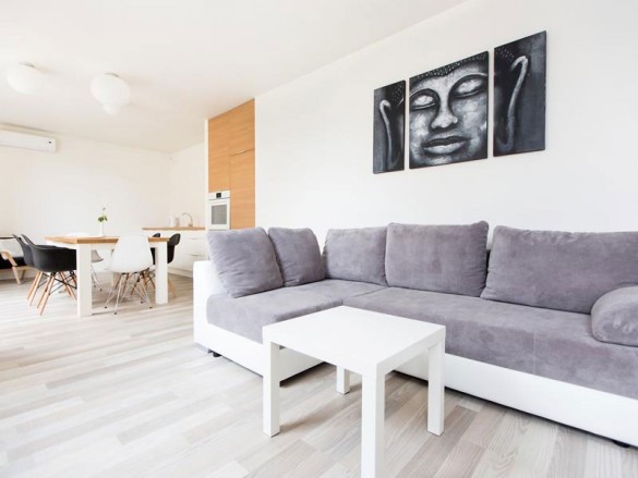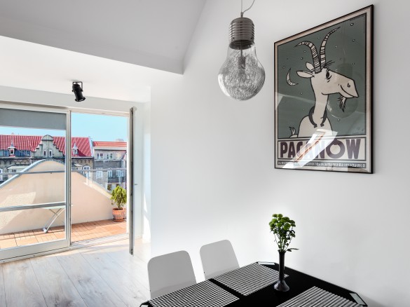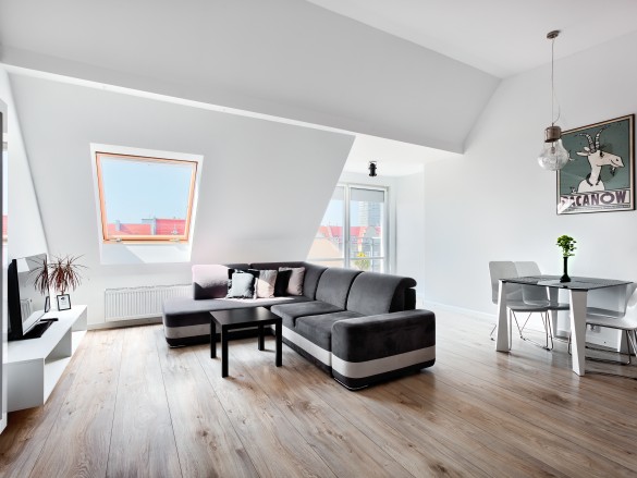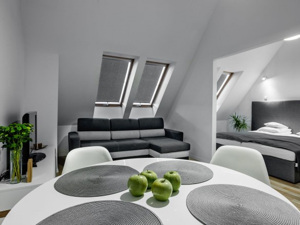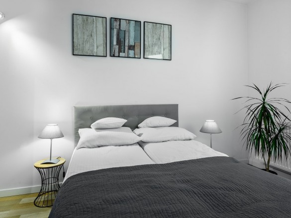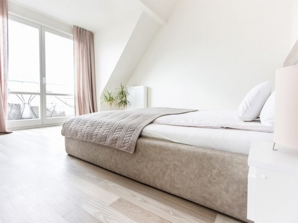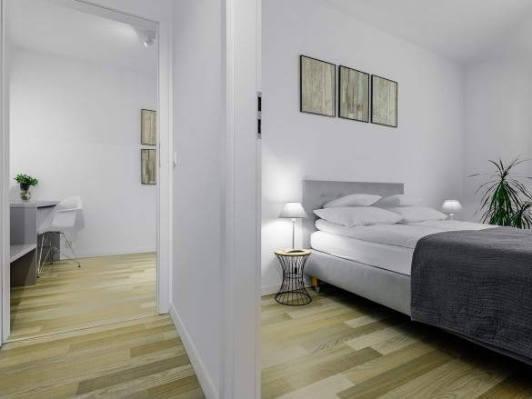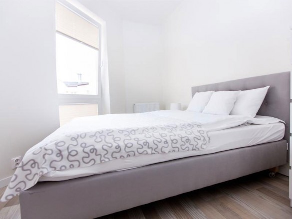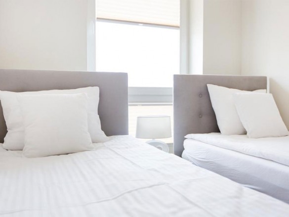 Apartament posiada dwie przestronne sypialnie - w jednej z nich znajduje się jedno dwuosobowe łóżko, w drugiej goście mają do dyspozycji dwa jednoosobowe łóżka. Dzięki dużym oknom jego wnętrza wyróżniają się jasnym wystrojem.