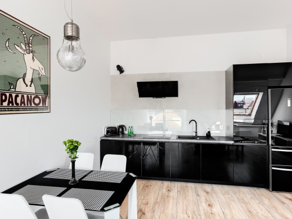 Jadalnia wraz z aneksem kuchennym posiada nowoczesny sprzęt oraz drewniane wykończenie. W salonie goście mogą relaksować się na komfortowej sofie. Dodatkowym elementem wyposażenia jest balkon.